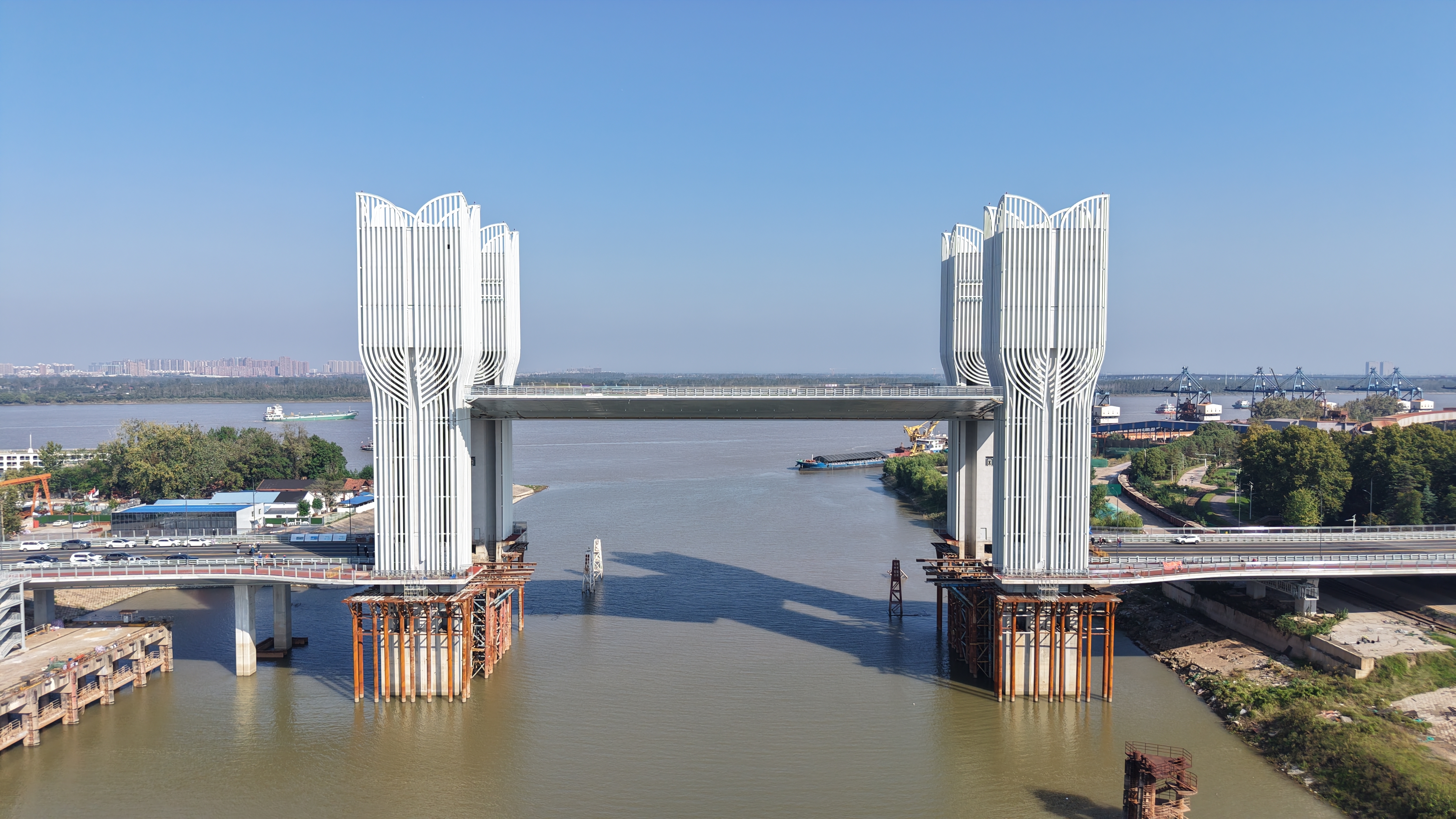 武汉右岸大道北段工程是武汉市“十四五”规划中“强化武汉都市圈协调发展”的重点工程,集防洪、航运、城市交通等功能于一体,紧邻长江干堤,全长约7.2公里,双向6车道。该工程沿途通过中韩石化、青山船厂及武钢等大型工业厂区,采用开启桥形式上跨武钢工业港河。