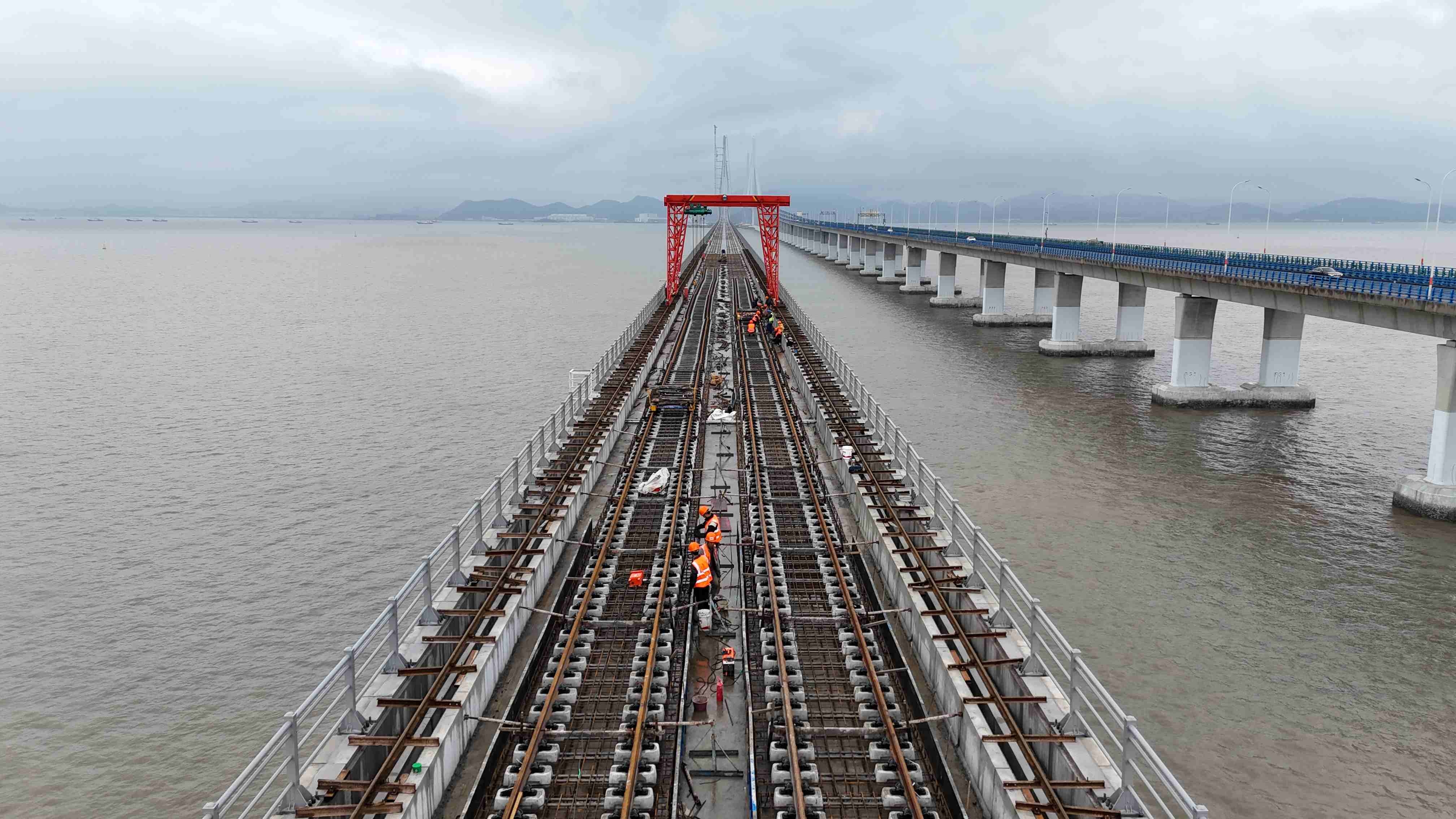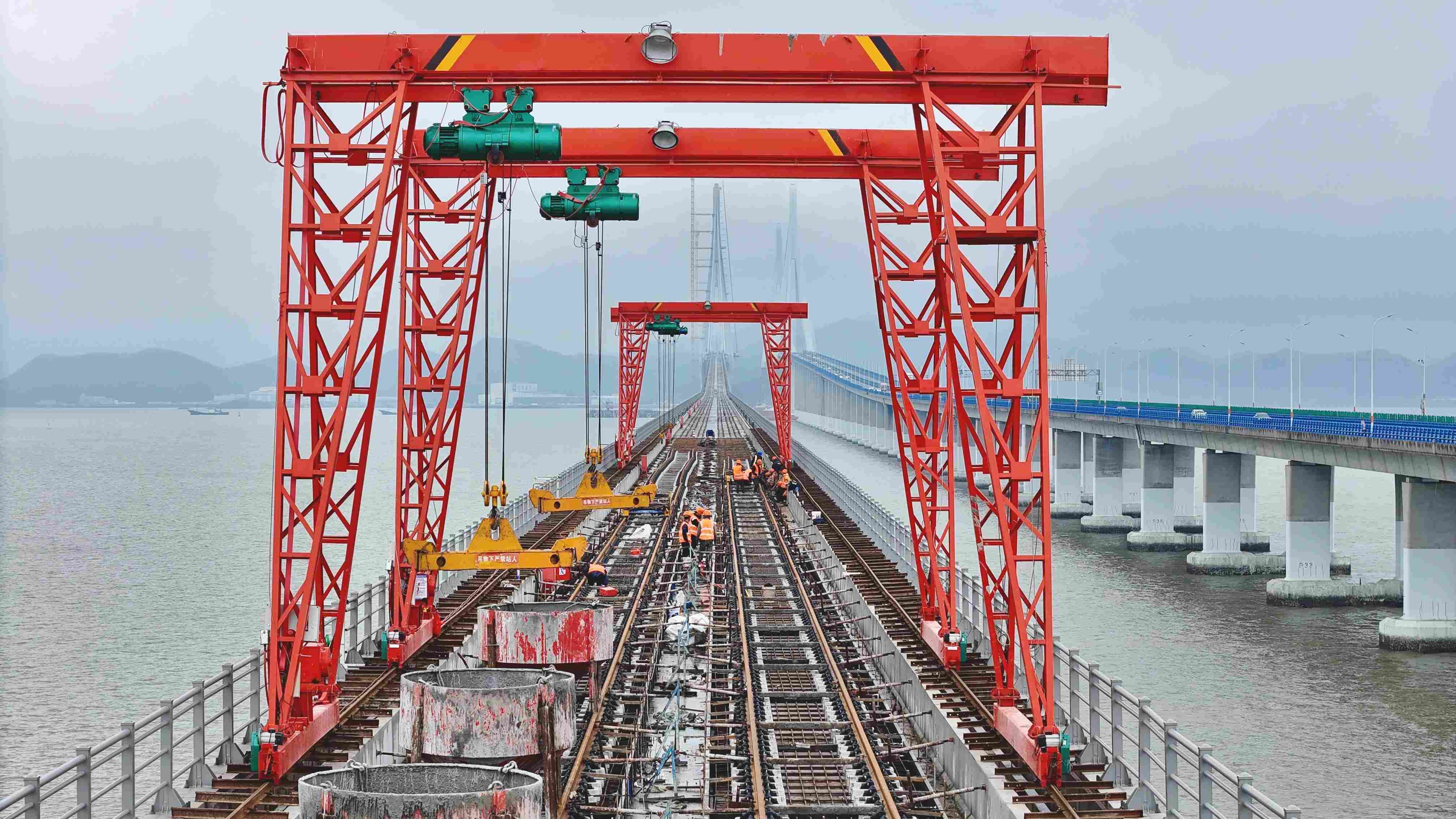 宁象线连接宁波城区与象山县,全长约61.45公里。象山跨海大桥是宁象线控制性工程,全长约8.3公里,为主跨688米的组合式钢箱梁斜拉桥,与既有甬莞高速桥相距仅50米,双桥比肩而立形成独特的“跨海双廊”壮丽景观。大桥建成后,将创下“国内首座市域(郊)铁路跨海大桥”“国内并行既有线最大跨径桥梁”“国内最大跨度组合式钢箱梁铁路斜拉桥”等多项纪录。