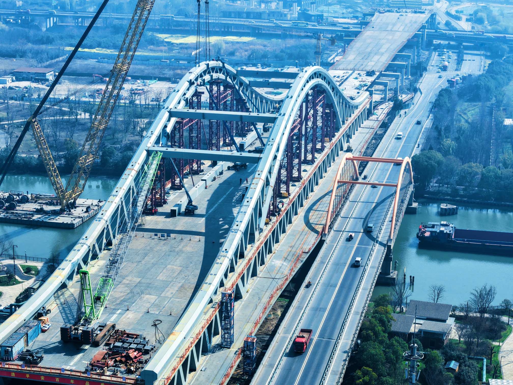 该桥是浙江省首座大跨径双层钢桁架拱桥,全长1.01公里,连接杭州市余杭与临平两区,呈东西走向横跨京杭大运河,主桥长300米,上层串联杭州都市区中环快速路,承载快速交通需求;下层为城市主干路与慢行系统,兼顾市民日常出行。中铁山桥负责约1.8万吨钢结构制造任务。