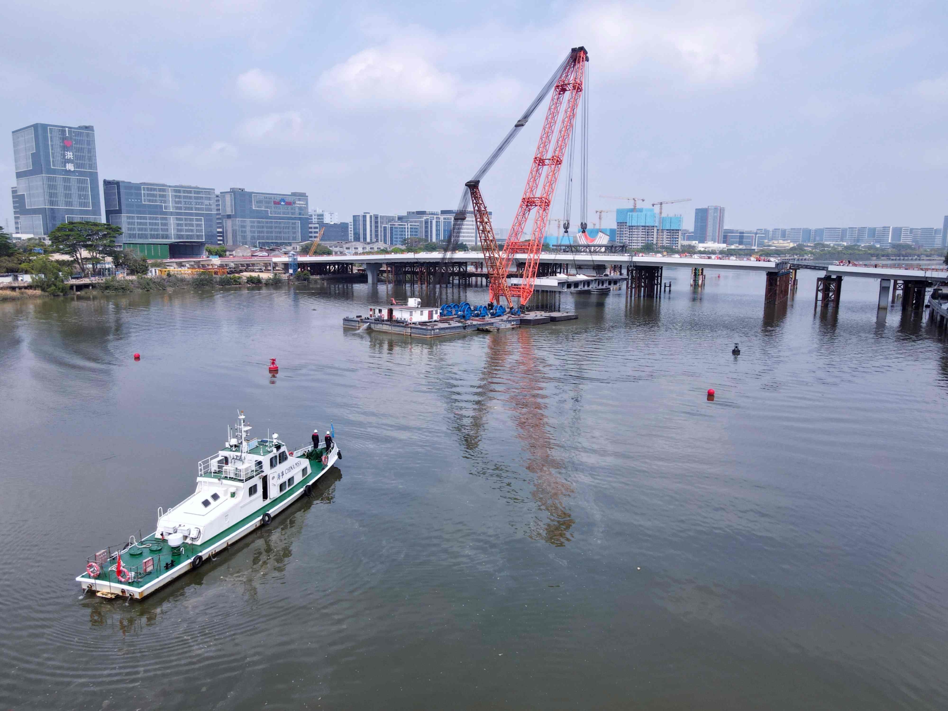 洪梅大桥位于珠江口水网地带,桥址处河流潮汐变化频繁、极端天气多发,施工环境复杂。项目团队采用“先梁后塔、原位吊装”施工方案,钢箱梁构件均在江门预制基地完成标准化生产后,经水路转运至施工现场吊装。