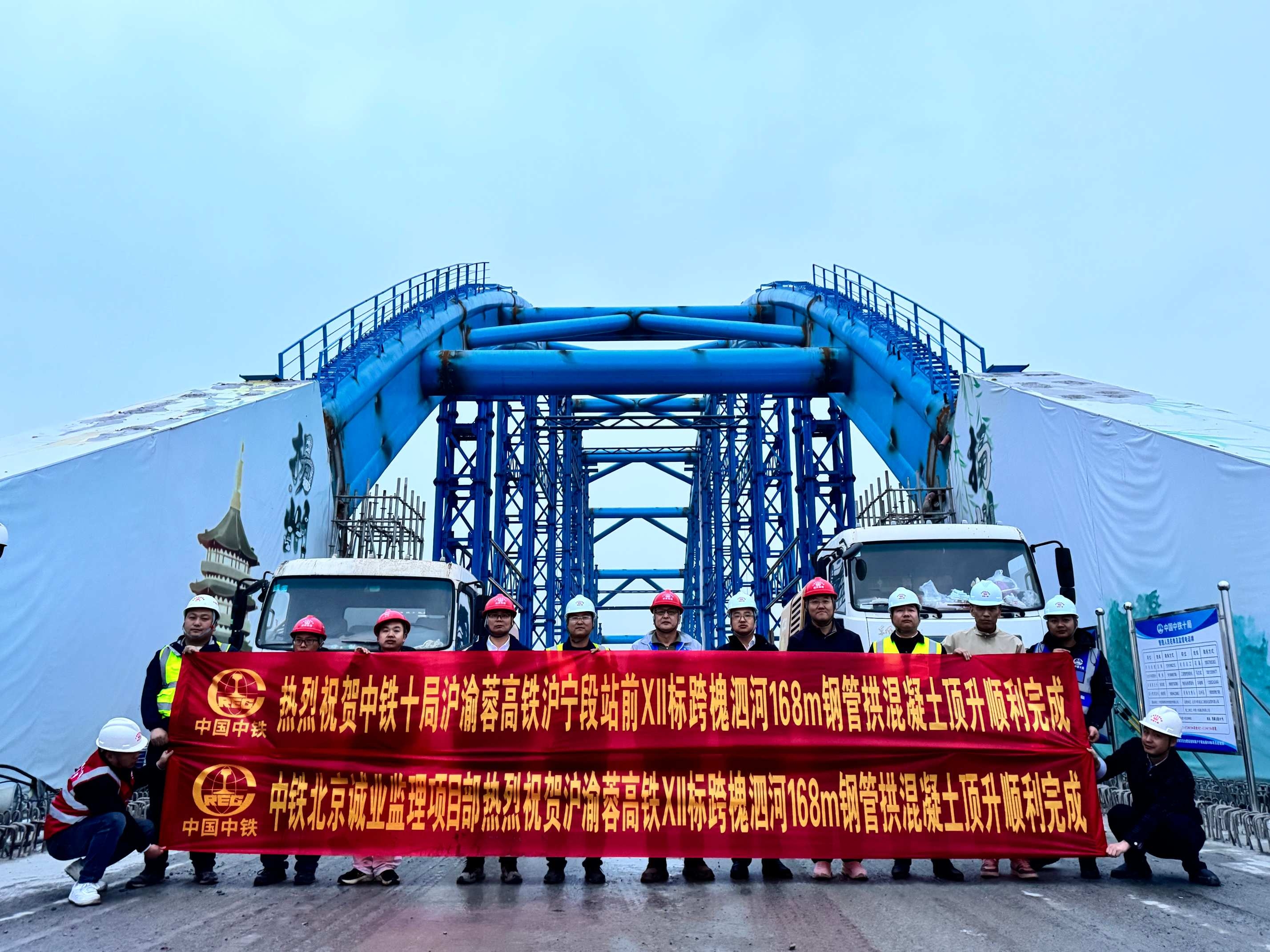 通泰扬特大桥是沪渝蓉高铁的重要组成部分,位于江苏省,横跨南通、泰州、扬州三市,全长约173公里,是目前世界上最长的在建桥梁。其中,跨槐泗河168米双薄壁连续刚构拱设计对铁路全线稳定性和安全性起重要作用。此次顶升作业是用高压泵把总计856立方米方量的混凝土从下往上灌满整个钢管空腔,全程无需人工振捣,依靠泵送压力实现混凝土的自然密实成型,提升桥梁结构的稳固性。项目团队精心部署,调配4台泵车和14台混凝土运输车连续供料,全力保障钢管拱结构施工质量与进度,实现关键节点按期完成。