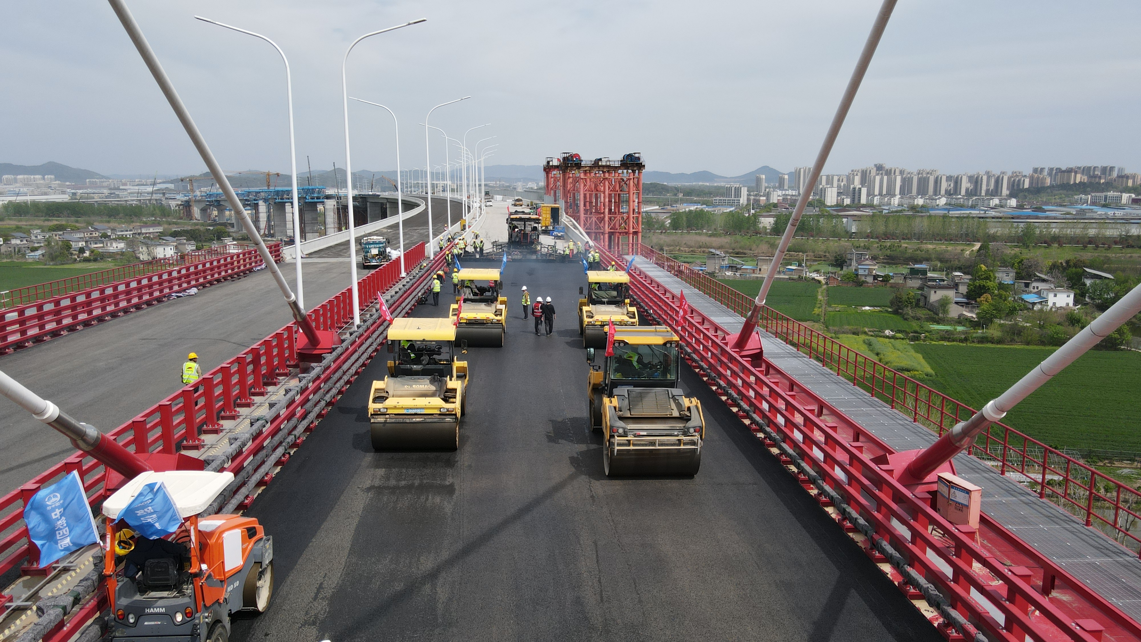 马鞍山长江公铁大桥副汊航道桥是世界最大跨度无砟轨道三索面钢桁梁斜拉桥,是巢马铁路全线重难点工程之一,连接安徽和县和当涂县,由和县侧引桥、主汊航道桥、江心洲引桥、副汊航道桥、当涂侧引桥组成,其中主桥长840米,主跨392米,采用公铁合建跨江方案,上层为双向六车道城市快速路,下层为双向四线铁路,此次铺装面积达22778平方米。