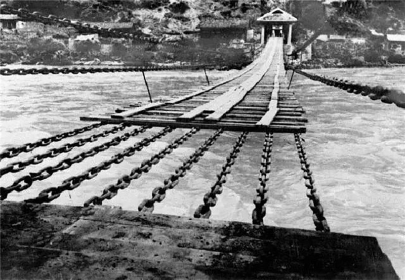 飞架于大渡河上的泸定桥是一条铁索桥。它没有桥墩,从河东岸到西岸扯了13根用碗口粗的铁环一个套一个联成的长铁索,两边各两根,算是桥栏,底下并排9根,作为桥面。人走在桥上摇摇晃晃,就像荡秋千似的。而此时,敌军先头部队已经赶到了泸定桥,将桥板全部拆掉,只剩下铁链,并在加紧构筑工事。红军面对的只是横空悬挂着的光溜溜的13条铁索。铁索离河面有30多米高,向桥下一看,真叫人心惊胆寒,红褐色的河水像瀑布一样,从上游的山峡里直泻下来,撞击在岩石上,溅起一丈多高的浪花,涛声震耳欲聋;铁索晃荡,令人生畏。桥头石碑上刻着:泸定桥边万重山,高峰入云千里长。